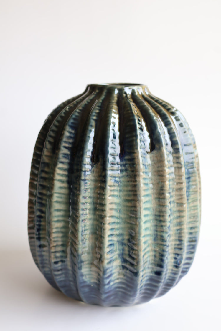 Florero redondo azul estriado